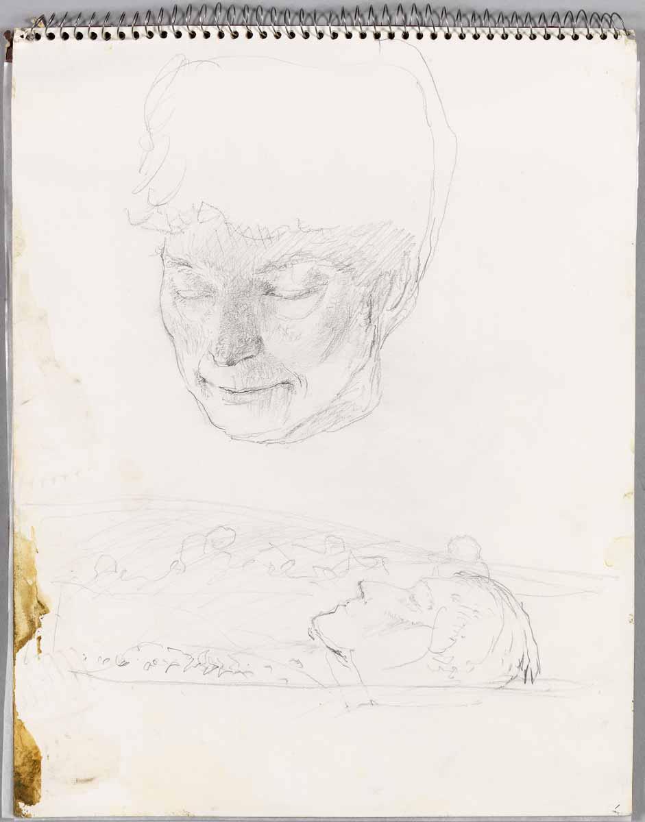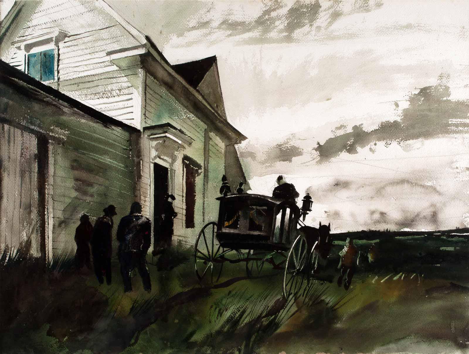 Although the “Funeral Group” drawings suggest Wyeth was exploring an idea for a larger work, he never completed one of his atmospheric tempera paintings based on the sketches. Instead, the drawings were left behind in the home of his friends in Chadds Ford, Pennsylvania. Only in 2018 were they rediscovered and connected to similar drawings in the Wyeth Foundation for American Art.