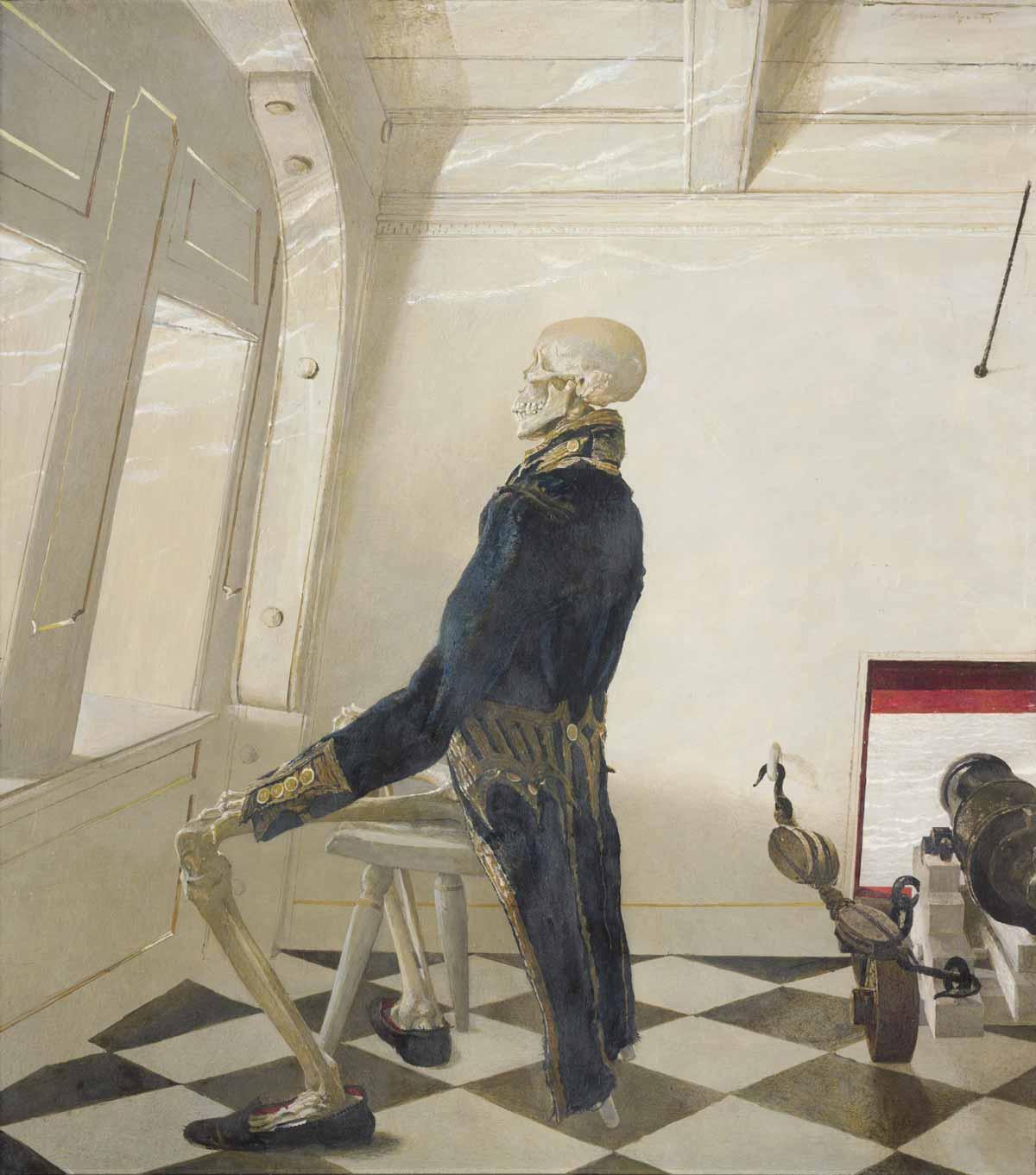 Wyeth’s Christina’s World (1948) is one of the most recognizable works of twentieth-century American art, yet the artist remains a polarizing and enigmatic figure who adhered to a pastoral realism amidst the rise of abstraction. In the rural settings that pervades his work, death is often a haunting presence. Until his own death in 2009, health issues punctuated Wyeth’s life, including a 1951 surgery to treat a serious lung disease. A typically oblique self-portrait was made following the operation called Trodden Weed, showing only Wyeth’s legs, clad in his father’s boots, walking on the desiccated grass of winter. His self-portrait Dr. Syn (1981), meanwhile, portrays a seated skeleton dressed in a blue military coat while Breakup (1994) pictures the artist’s own hands desperately reaching through the broken ice.