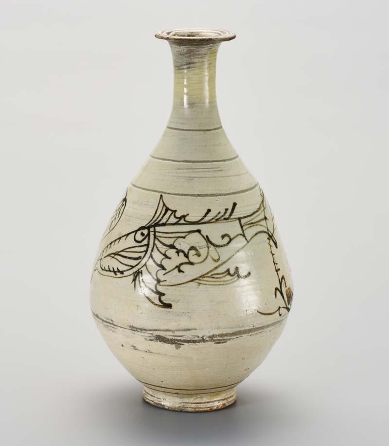 As its title indicates, the ceramics show spotlights sublime buncheong works, most from the 15th century. The exhibit’s two primary curators — Hyonjeong Kim Han, the DAM’s Joseph de Heer Curator of Arts of Asia, and Ji Young Park, the DAM’s National Museum of Korea Fellow of Korean Art — are women, but Korean ceramists are almost exclusively men. In galleries aglow with the gray-green pottery, the curators spoke to the importance of buncheong ware for Korean identity and history, as well as the progression of ceramics once freed from imperial mandates.