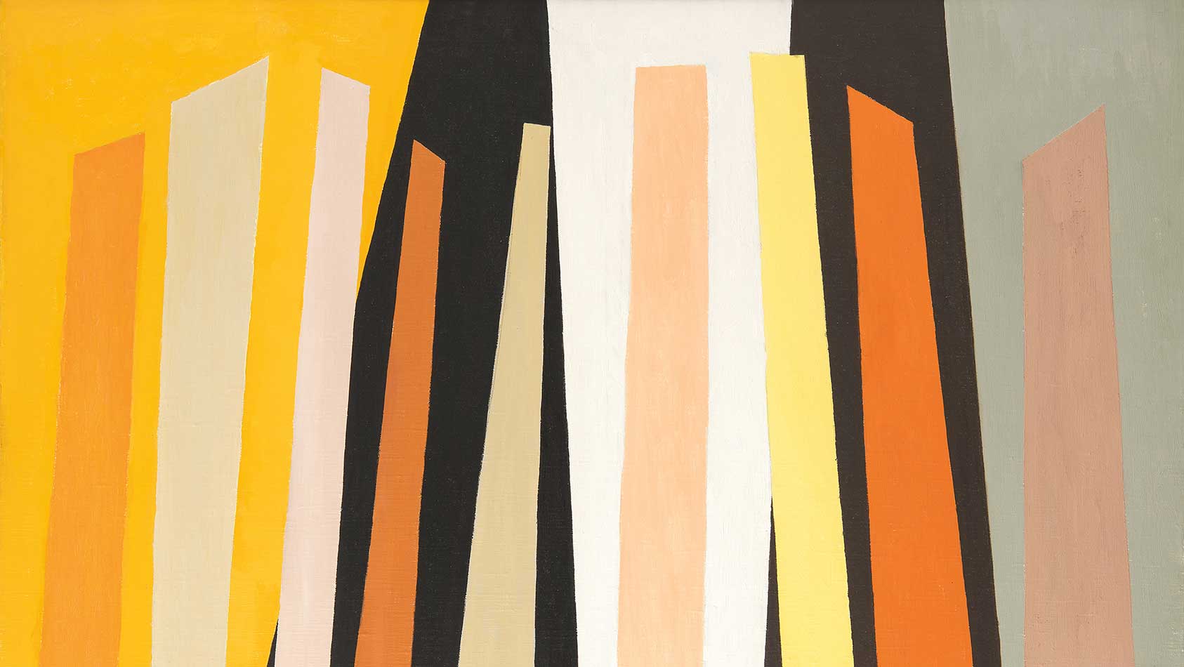 Her uncompromising style, refuting gestural Abstract Expressionism was quite unlike anybody else’s. Though her paintings evoke in many ways the clarity of geometric abstractionists, the color relations and elegant forms of the modernists, but more than anything, her Shutter Paintings are slyly active, featuring narrow apertures. The stripes appear to expand and contract, generating a sense of motion and even sexuality as triangles merge. Looking at Mason’s paintings of the 1960s, we note, above all, that everything is a little bit different from the other paintings being done, albeit clearly in communication with the modernist lingo.