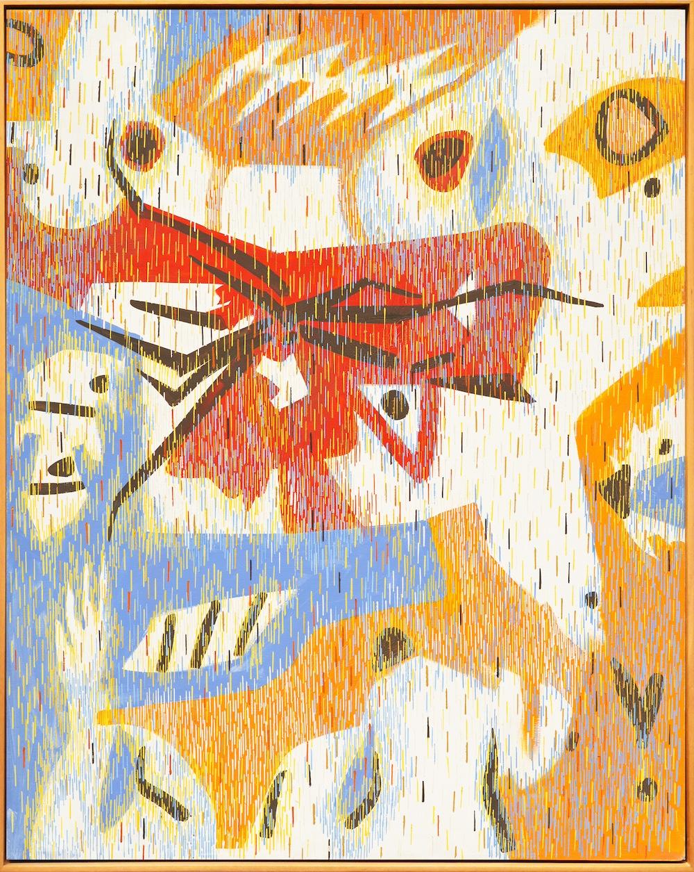 While the 40s were spent in war as an aerial topographer, Lee Mullican’s paintings from 1956 to 1958, made shortly after his move to Los Angeles, marked a subtle yet striking shift in his practice. During this time, his compositions begin to open up. What once felt densely packed and earthbound now lifts, breathes, and expands. Familiar patterns of fine, ridged lines, applied with the edge of a palette knife, still pulse across the canvas, but they gather more loosely, like constellations forming and dissolving in a night sky. Hints of blue emerge in place of the deeper earth tones of earlier works, lending an airier, more ethereal quality. These pieces offer a glimpse of Mullican in transition, experimenting with space, color, and form as he moved toward the more minimal, monochromatic paintings he would later create in the 1960s and ’70s.