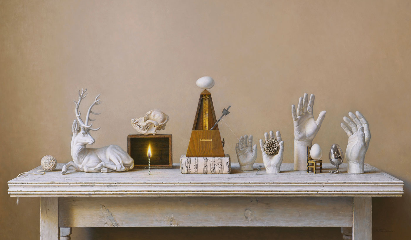 Yet, without a doubt, he is. Fraser's mastery of lifelike detail is such that one might be tempted to take a fingernail to a piece of tape on a painting, for example, to see whether the tape is real or rendered in oil.
