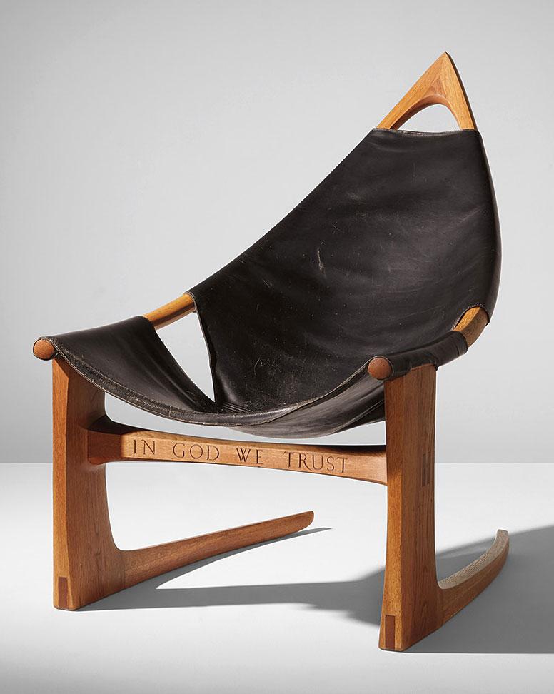 Wendell Castle gleefully and deliberately blurred the line between furniture and sculpture for six decades, and carried on innovating until he died in January 2018. The American artist’s fourteen adopted rules of thumb, which appear at the tail of his biography page on the website of the Friedman Benda gallery, which represented him, includes this edict: “If it’s offbeat or surprising, it’s probably useful.” His In God We Trust chair reflects all three of those qualities. Fashioned by Castle in 1964, the unique oak and leather chair features the phrase on its crossbar, inscribed in a suitably sober font.