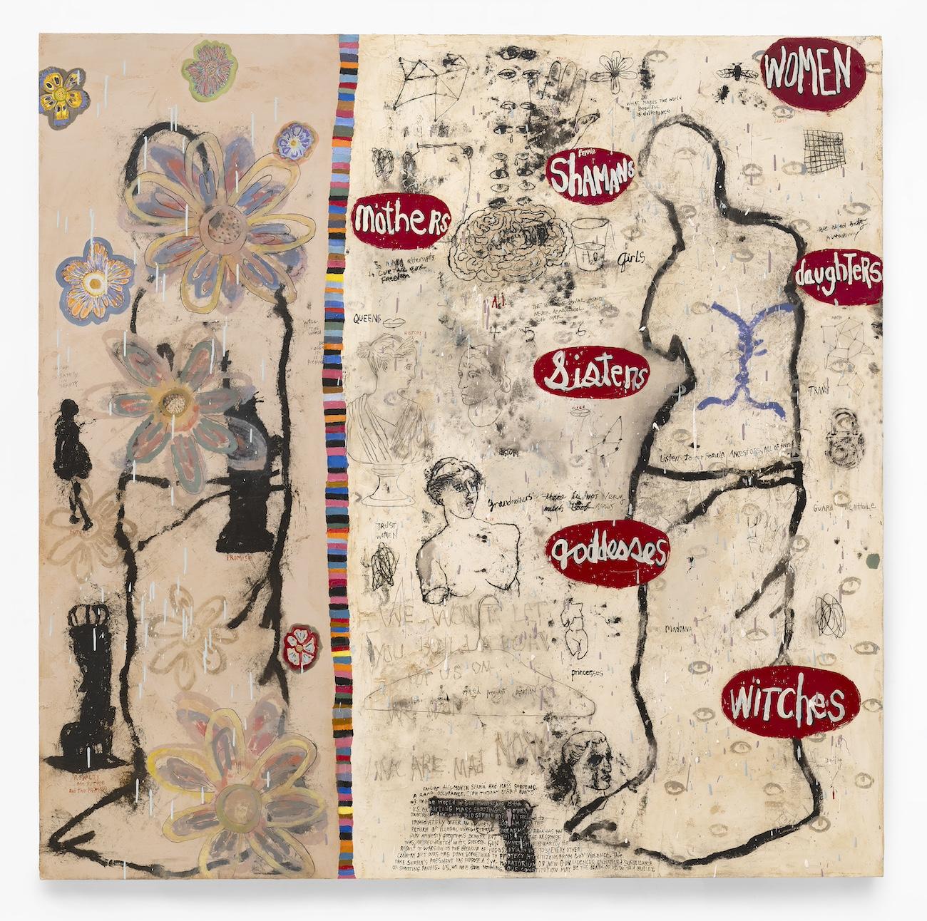 Squeak Carnwath, Ancestors and Future Ghosts, 2023, Oil and alkyd on canvas over panel, 65 x 65 inches