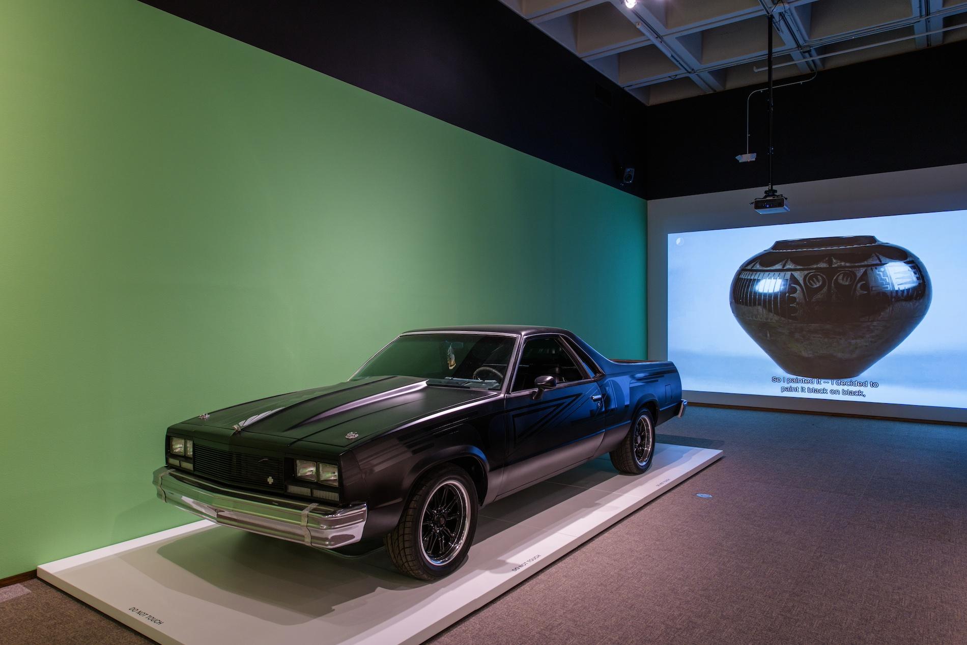 One such work is a different kind of vessel: Maria. Simpson rebuilt and customized this 1985 Chevy El Camino, while honoring San Ildefonso Pueblo potter Maria Martinez, who redeveloped traditional Tewa black-on-black pottery designs. Empowering group “transformances” featured participants in black post-apocalyptic attire, complete with Maria’s loud heartbeat on a subwoofer.