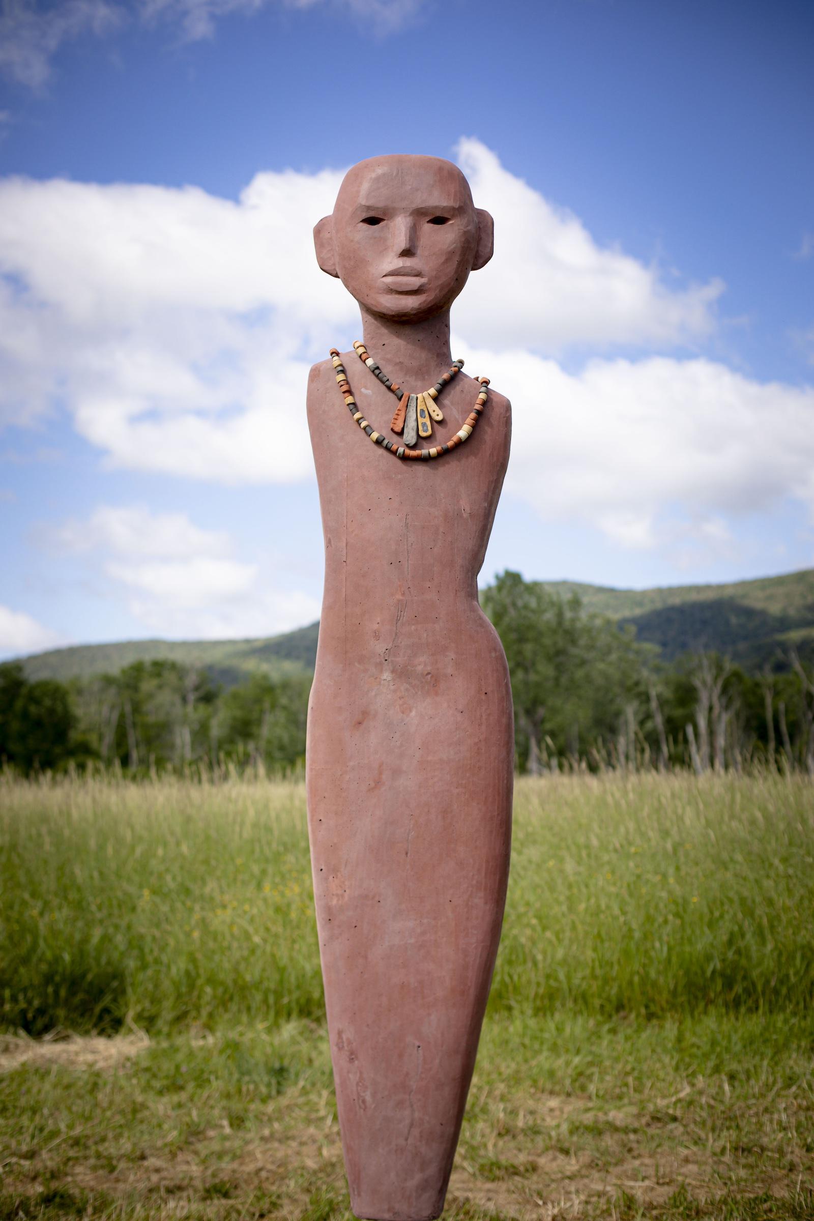 Rose B. Simpson, Counterculture, 2022, at Field Farm, Williamstown, MA. Twelve dyed-concrete and steel sculptures with clay and cable adornments. Each sculpture 128 x 24 x 11 inches. Commissioned by Art & the Landscape, a program of The Trustees, Massachusetts.